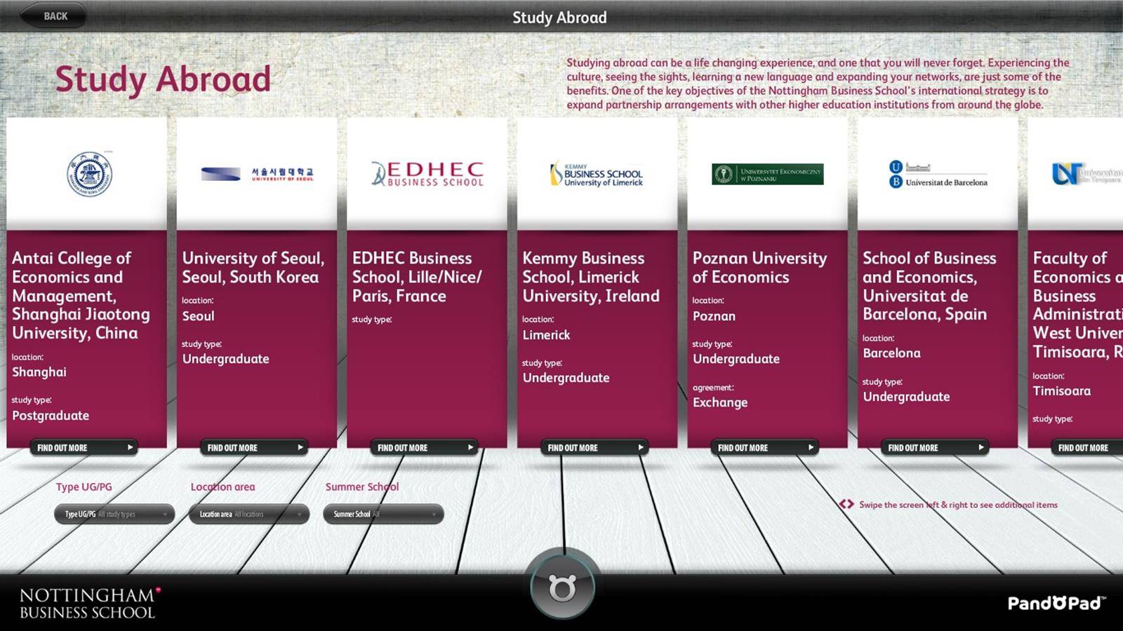 Applications were developed to create a unique info point for students. Within seconds the students can search current job placements, info on their course and tutors, exchange opportunities and upcoming events. All of this is displayed via interactive touch screens utilizing our PandoPad applications.