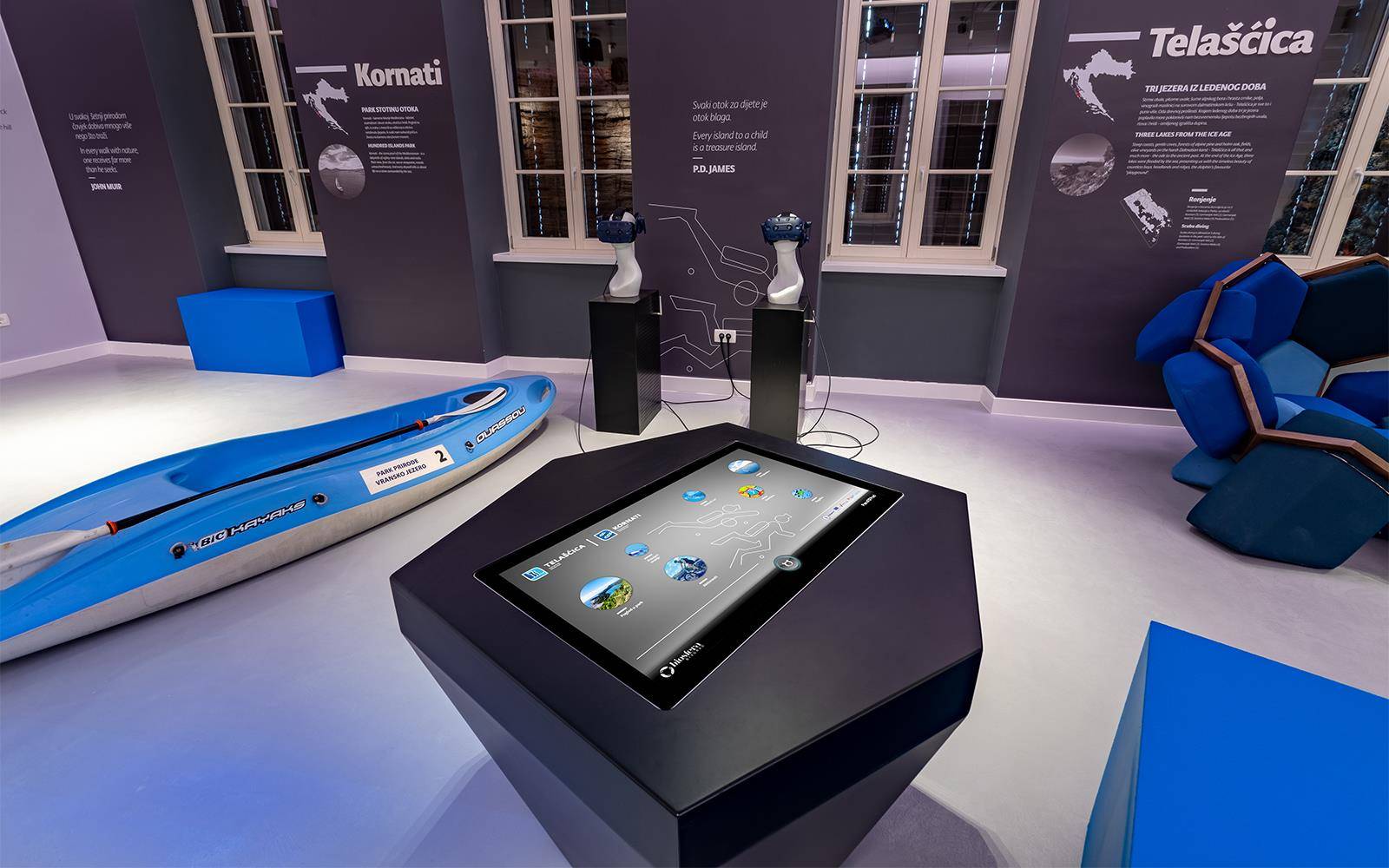 A wide range of multimedia equipment was delivered, such as the PandoPad® WALL unit interactive screen, interactive tables, VR glasses that bring the beauty of the Dalmatian regions closer, a large wall projection, 3D mapping caves, floor interactive projections, a fishing game on Lake Vrana, and a large package of PandoPad® applications. Finally, PandoPad® Manager CMS was delivered as a central place for managing all content.