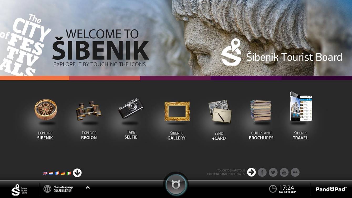 The solution had to be equipped with a package of centrally managed multimedia applications and in the creative part of the project, it was necessary to study the tourist offer of the City of Šibenik, develop visual content and design user interfaces.