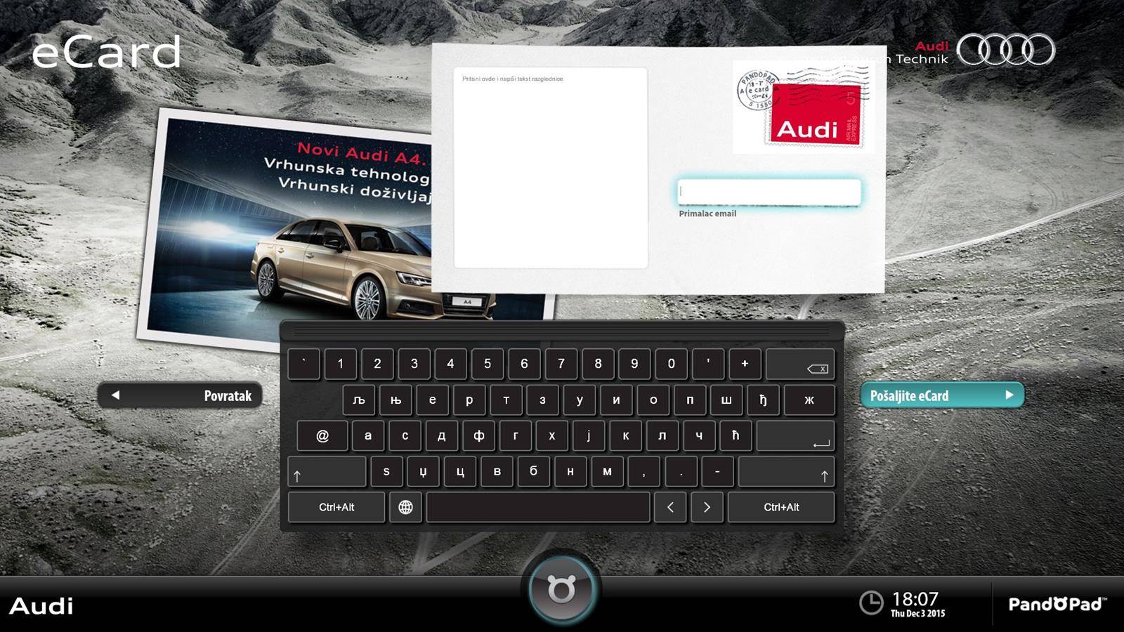 As part of the promotion of the new Audi A4, an interactive multimedia kiosk has been set up in the Delta City shopping center through which visitors can find out all the features and performance of the latest car model. Visitors were able to view the latest promotional videos and photos, flip through a digital brochure, send an e-card and leave their impressions of the new model.