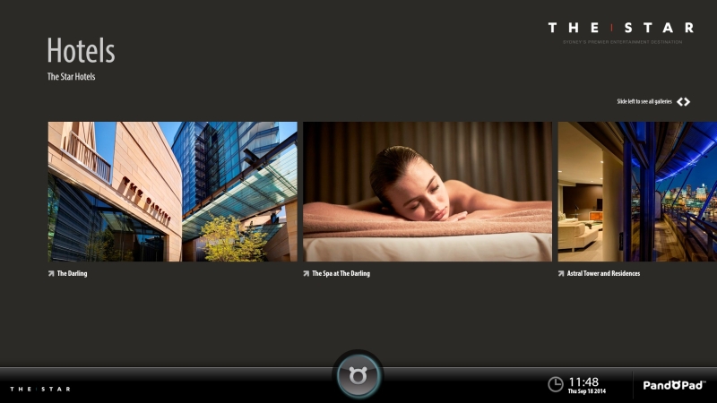 A user is offered album browsers to select a group and navigate through content moving things around the screen by hand. Graphic and video content may contain photos of featured products, services, landmarks, video presentations, etc.